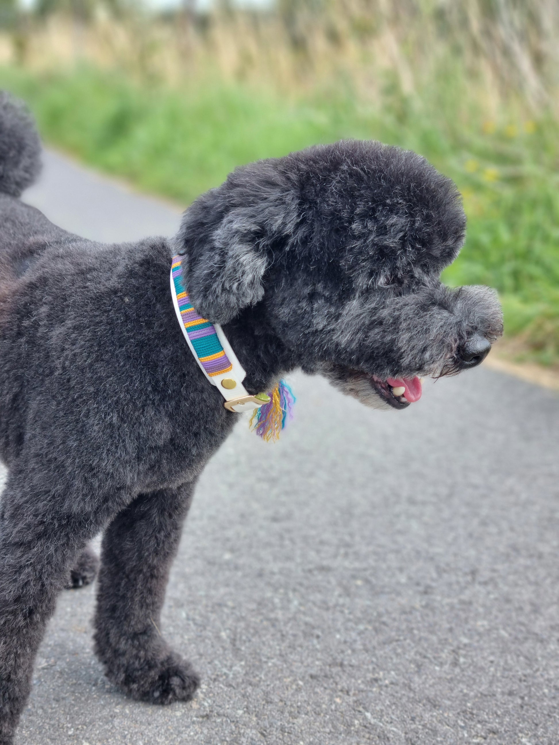Gemaakt van duurzaam, waterdicht Biothane en afgewerkt met een kleurrijk geweven koord. Elk stuk is een uniek spel van kleur, textuur en vakmanschap.